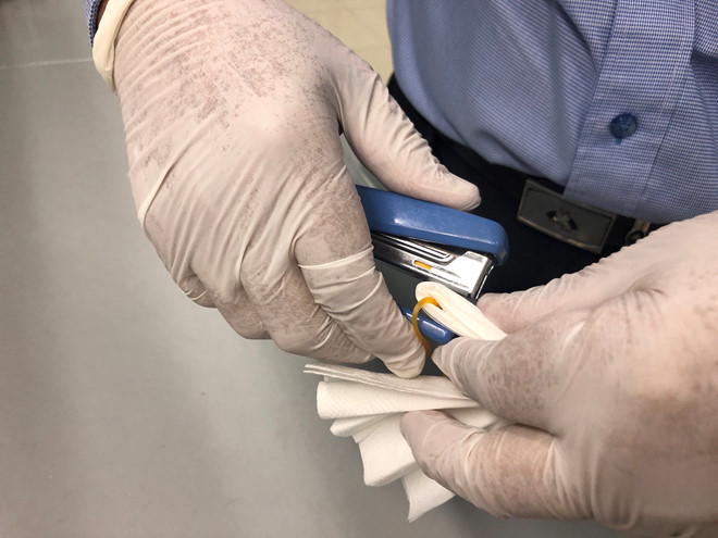 Tiến sĩ, bác sĩ Vân cho biết để có một chiếc khẩu trang 4 lớp, đầu tiên cần chuẩn bị 2 miếng khăn giấy loại tốt, 4 sợi thun và chiếc kim bấm giấy.