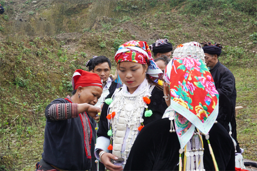 Đội kèn trống và người chủ trì của gia đình trai sẽ ra cổng đón nhà gái. Họ mang theo một chiếc giỏ lớn để cô dâu đựng đồ đạc của mình. Họ không dẫn cô vào nhà ngay mà di chuyển qua một bãi đất trống, chờ cô dâu thay trang phục truyền thống của người Dao Đỏ ở Sa Pa rồi mới tiếp tục làm lễ. Trong thời gian chờ, gia đình chú rể đem trà và rượu mời từng người trong họ nhà gái.