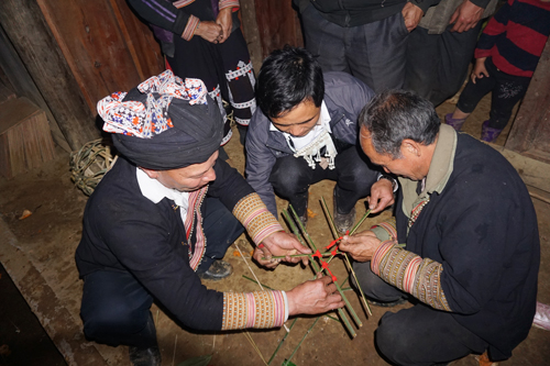 Sau 22h, người chủ trì hai bên ngồi ở hiên nhà, vót tre nứa để làm lại mũ đội đầu cho cô dâu.