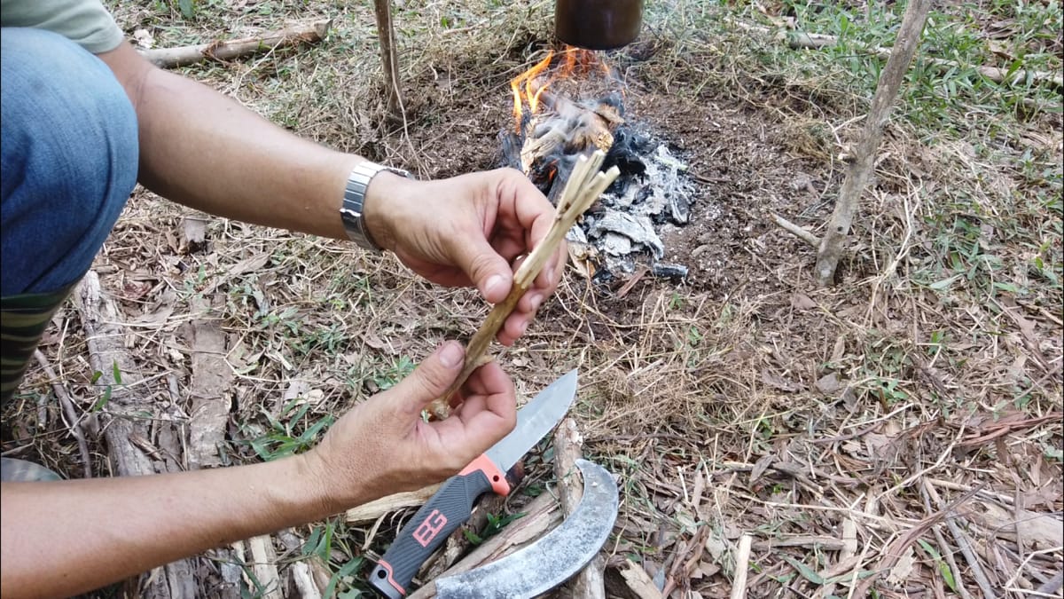 Các bạn chọn một cành cây khô nho nhỏ, đường kính khoảng 1cm đến 1,5cm. Trong rừng sâu có nhiều loại cây có độc trên thân, việc phân biệt cây độc và không độc đòi hỏi phải có nhiều năm kinh nghiệm. Tuy nhiên, nếu chúng ta đi cắm trại hoặc picnic ở những nơi ven rừng, hồ, suối thì đa số đều là cây lành tính như cây keo, cây tràm, cây bạch đàn, khuynh diệp… Ở đây mình dùng cây keo lá tràm và bước đầu tiên là gọt lớp vỏ bên ngoài.