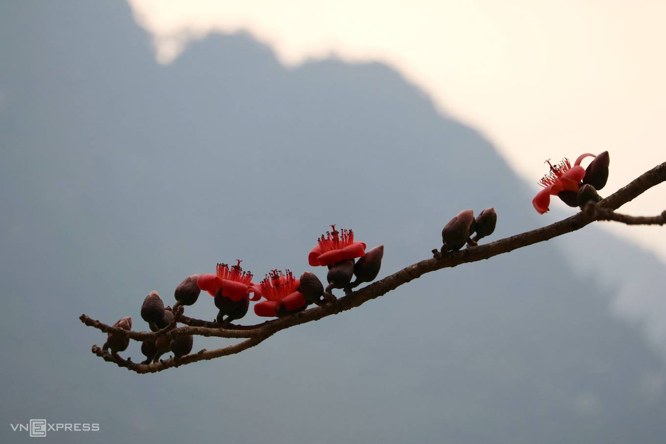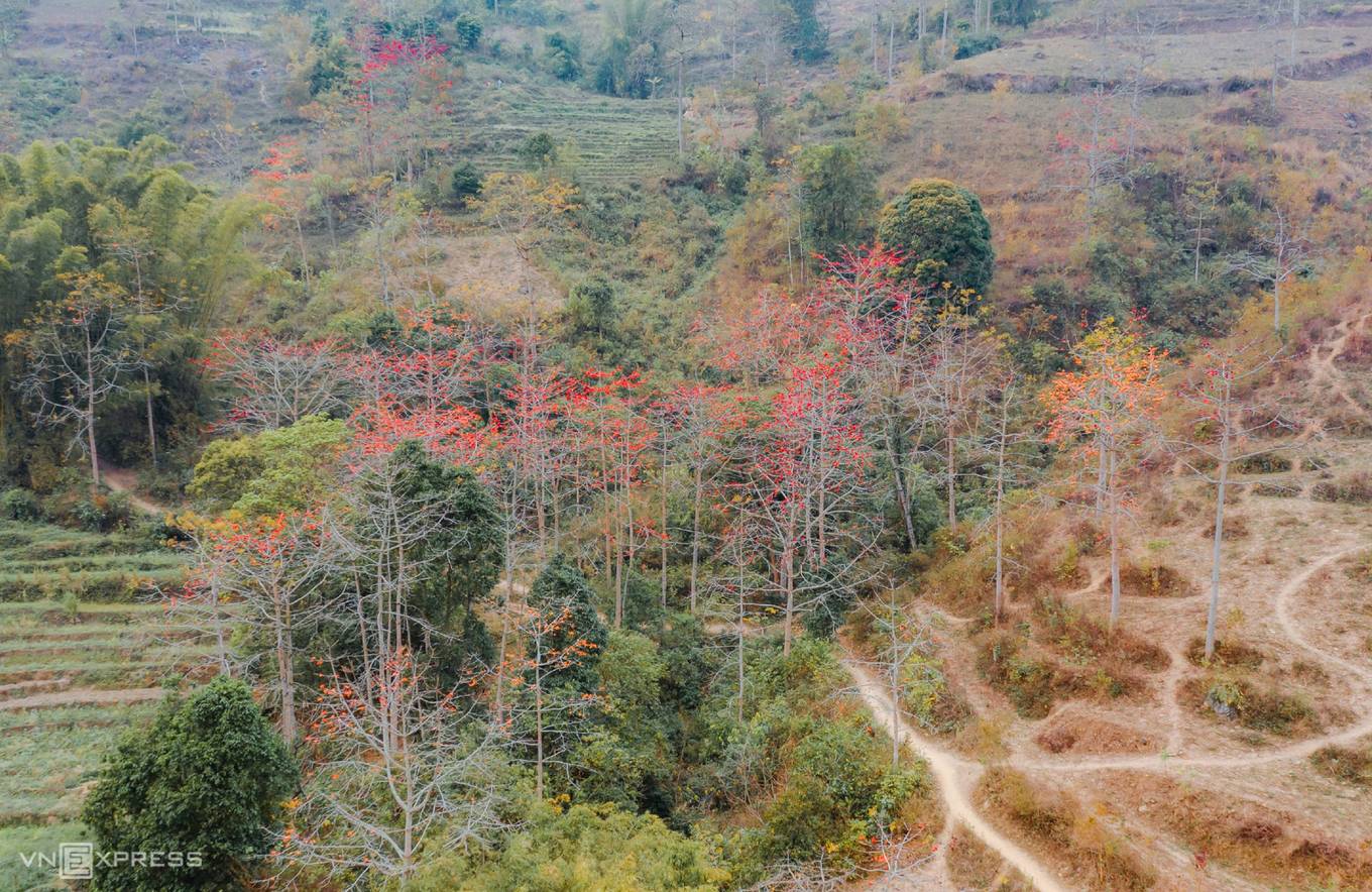 Vạt hoa gạo nở dọc triền nương. Ngoài sắc đỏ đặc trưng, nhiều cây gạo tại đây còn có màu cam. Theo người dân địa phương, năm nay hoa gạo ở Hà Giang nở nhiều và đẹp hơn các năm trước. Khắp núi rừng Hà Giang, đâu đâu cũng thấy màu hoa gạo.