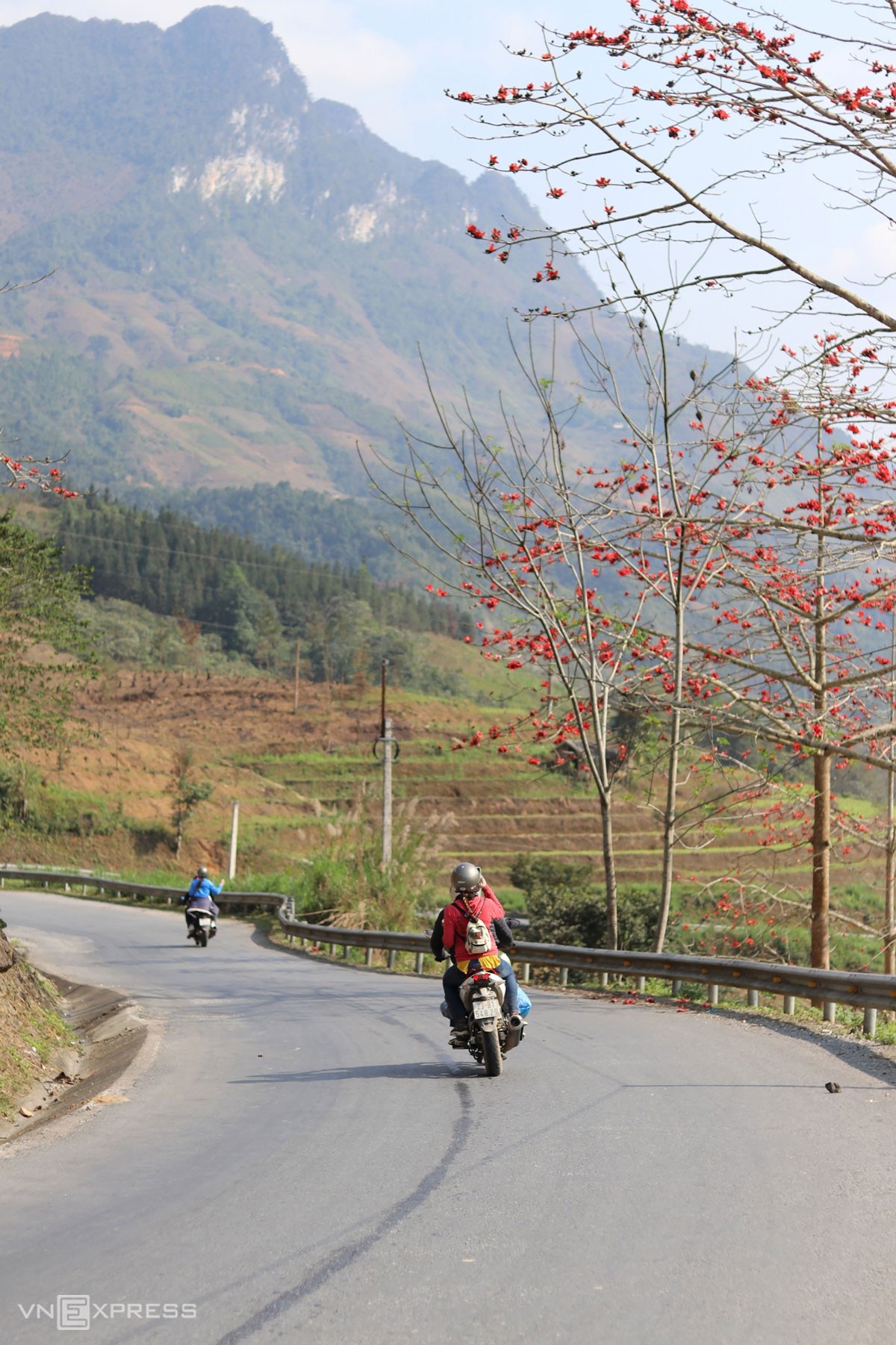Hoa gạo nở đỏ rực ở dốc Bắc Sum. Cùng với Cổng Trời và Núi đôi Quản Bạ, dốc Bắc Sum là một trong những điểm tham quan chính ở Hà Giang.