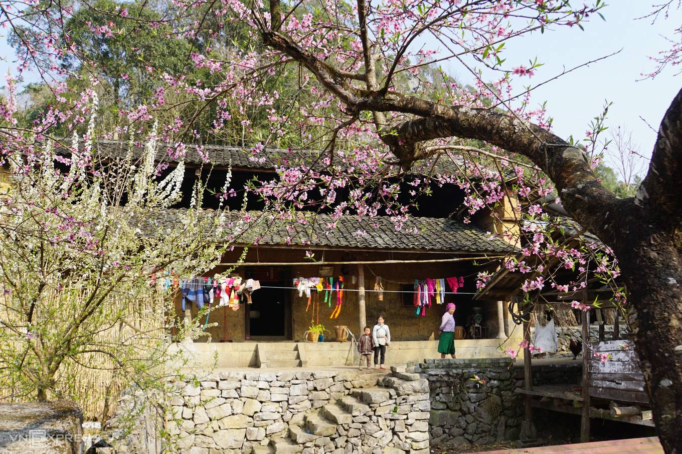 Hoa đào, mận đua nở trước căn nhà trình tường đặc trưng của người Mông.