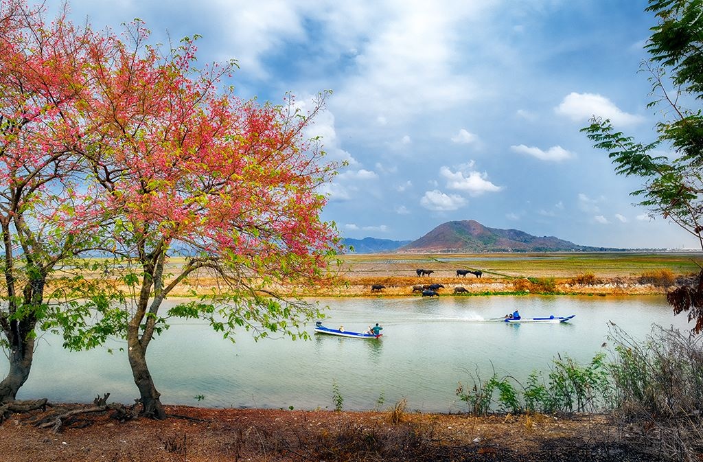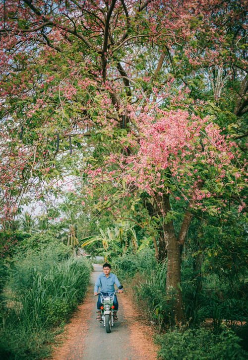 Hoa ô môi còn được biết đến với cái tên “hoa anh đào miền Tây” có nguồn gốc từ Nam Mỹ. Cây ô môi có thân gỗ cao 10 - 20 m, thích hợp với thổ nhưỡng miền Tây Nam Bộ nên được trồng làm cảnh và lấy bóng mát. Ảnh chụp cánh đồng quê được tô điểm sắc hồng hoa ô môi tại Tân Châu, An Giang. Ảnh: Huỳnh Phúc Hậu.