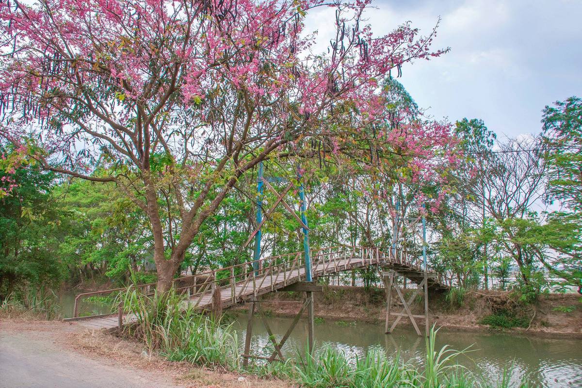 Chiếc cầu quê hương Phú Long, Phú Tân, An Giang thêm sắc hồng vào mùa hoa ô môi. Ảnh: Ngọc Thanh Hồng.