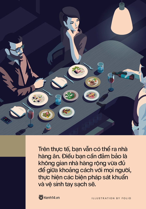 Nhiều nhà hàng, quán bar, hàng ăn đã đóng cửa từ tuần trước tới giờ. Tuy nhiên, vẫn sẽ có những nhà hàng mở cửa phục vụ khách du lịch hay một lượng người còn đi làm, những người không nấu ăn. Trên thực tế, bạn vẫn có thể ra nhà hàng ăn. Điều bạn cần đảm bảo là không gian nhà hàng rộng vừa đủ để giữa khoảng cách với mọi người, thực hiện các biện pháp sát khuẩn và vệ sinh tay sạch sẽ. Hạn chế chạm lên bề mặt bàn ghế, tay nắm vệ sinh.