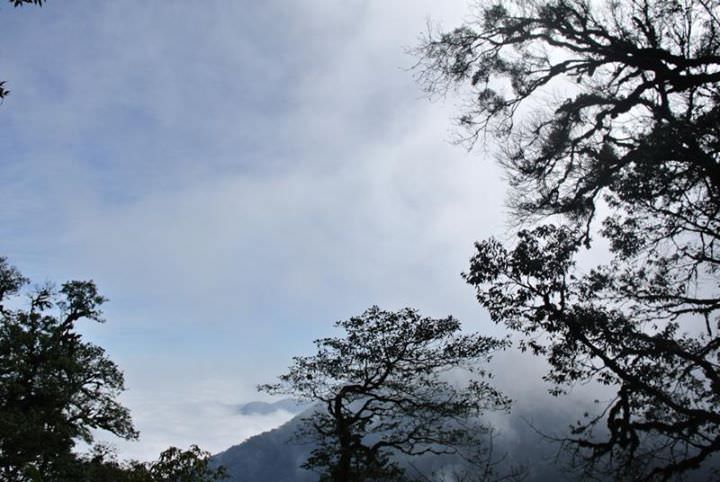 Tôi ngồi trên một khúc cây đổ ngang cheo leo giữa vách núi dựng đứng, chờ đợi cho mây bớt đi để lưu lại những khoảnh khắc của đỉnh núi, máy ảnh cứ chực sẵn - hôm nay tôi không mang chiếc DSLR nào mà dùng loại compact nikon 1 cho gọn nhẹ. Một ống tele mang theo thì bị trục trặc không chụp được ảnh nào, chỉ còn mỗi ống fix 50mm. Cứ chờ mãi, chờ mãi, nhưng hết đợt mây này đến đợt mù khác ào tới, rồi những giọt mưa nhỏ tạt ngang dọc khiến nhiều ảnh không thể lấy được nét. Nhưng đỉnh núi cứ mờ ảo, khi ẩn khi hiện như trêu ngươi. Không biết ngồi như thế bao lâu, chợt nghe văng vẳng tiếng Sinh hú hét ở dưới: Anh ơi xuống đây đẹp lắm. Tôi vội tụt xuống theo Sinh và Chuẩn. Xuống 50m rồi 100m, bỗng đâu mây mù như chợt vén ra để lộ khoảng trống trắng toát dưới chân, thấp thoáng dưới kia, ở độ cao khoảng 1800m là một biển mây trắng xốp, bồng bềnh êm ả, khác hẳn với khung cảnh gió núi thét gào mây mù cuộn đặc trên này. Tôi tụt xuống được hết vách núi và chạm chân vào một sống núi khá cao và hẹp, chỉ chừng 1,5 đến 2m chạy từ lưng chừng đỉnh núi xuống hút phía dưới, ở đây cây cối khá rậm rạp che khuất phần lớn tầm nhìn xung quanh. Chúng tôi có thể chạy nhanh trên sống núi bằng phẳng này, cố gắng tìm một khoảng quang đãng để chụp ảnh như sợ biển mây tan mất. Nhưng mù càng ngày càng thưa, biển mây đây rồi, mây bồng bềnh phía dưới như bông trắng tinh, êm ả và phiêu diêu như thiên đường trong khi bên trên gió vẫn ào ạt thổi. Phóng tầm mắt từ sống núi qua một khoảng cây thưa, bên trái tôi nhận ra đỉnh núi Nhìu Cồ San nhờ hình thù giống hệt như mái TT Hội nghị Quốc gia ở Hà Nội, cạnh đó là đỉnh núi 2700m ở Bát Xát, rồi một phần dãy Bạch Mộc Lương Tử.