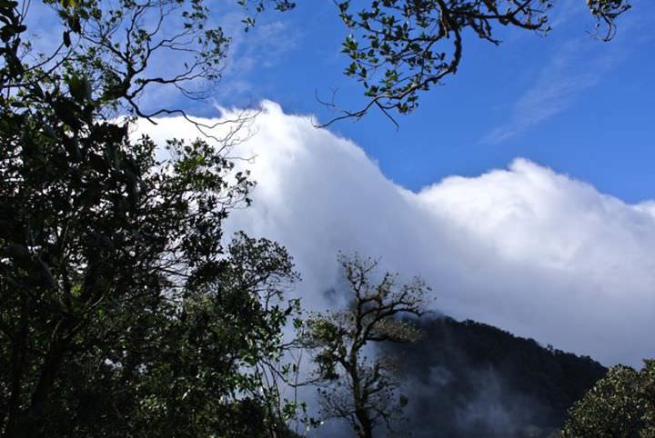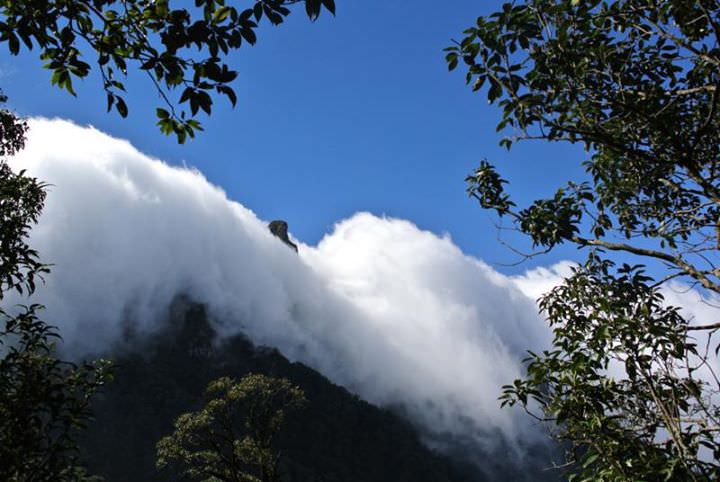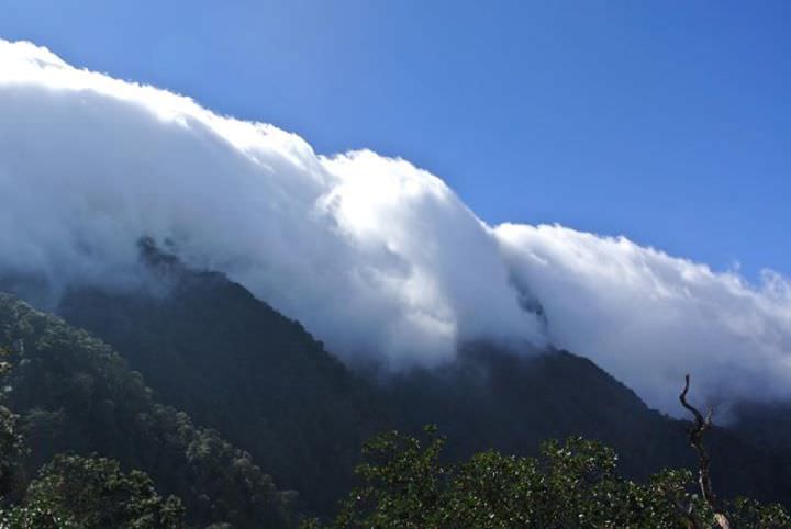Từ trên cao, một dòng thác như thể đang đổ ập xuống đầu chúng tôi, gần đến nơi chợt những con sóng tung bọt trắng xóa hung dữ tản đi đâu mất! Những tiếng ù ù của gió lớn khiến ta cảm giác như đang ở trong dòng thác thật sự. Thì ra chúng tôi vừa chui ra từ thác mây Ngũ Chỉ Sơn, con thác lớn gấp hàng ngàn lần thác Bản Giốc. Cảnh tượng thật huy hoàng quá đỗi khiến tôi kinh ngạc không thể thốt lên lời nào. Gió mùa đã đẩy biển mù bên kia qua đỉnh núi, nhưng khi qua được đỉnh chúng gặp lạnh và ngưng tụ lại thành mưa rồi đổ xuống như một dòng thác lớn.