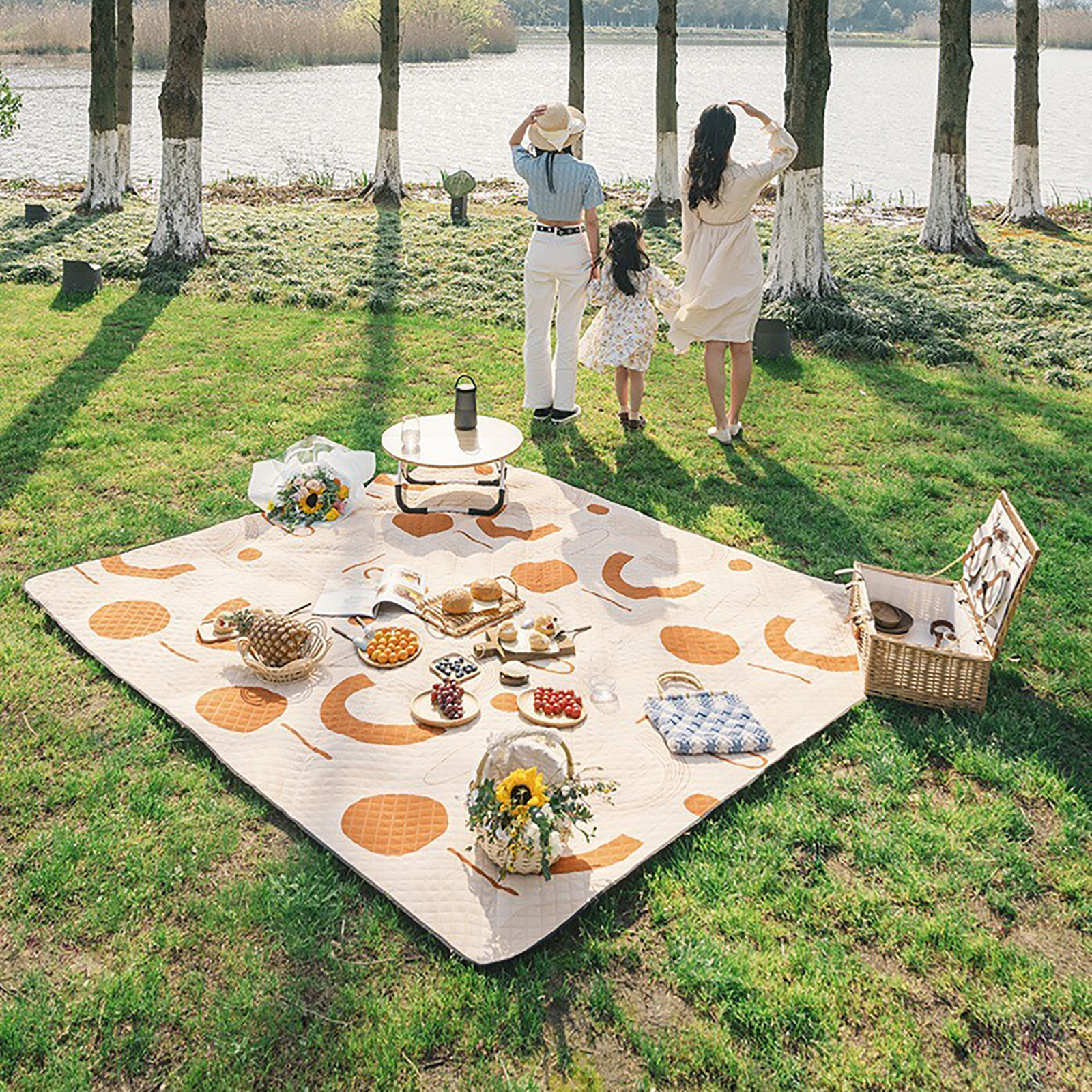 Nhiều họa tiết đẹp mắt; lớp giữa là một lớp bông giữ nhiệt và lớp cuối của thảm được làm bằng chất liệu vải Oxford cách nhiệt, chống thấm nước, chịu mài mòn, khi dùng xong chỉ cần dùng vải ẩm lau nhẹ là sạch bóng.