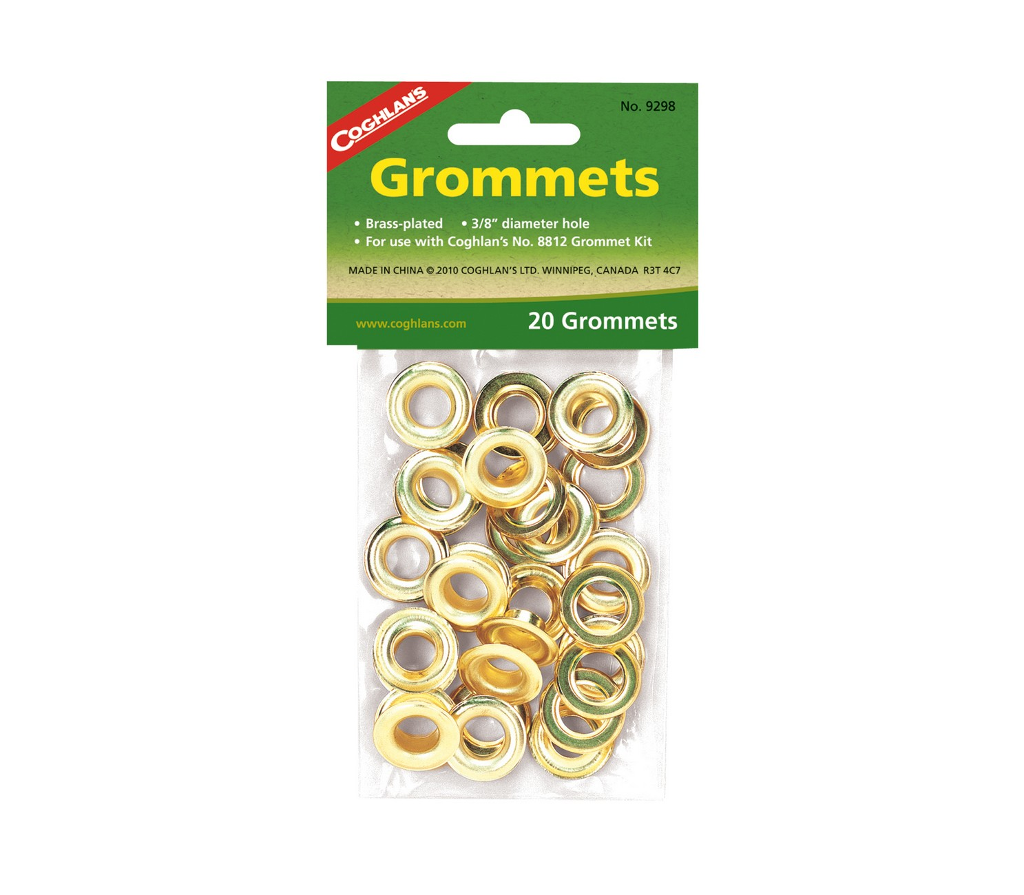 Use with Coghlan’s #8812 Grommet Kit. 20 - 3/8” – brass plated grommets per bag.