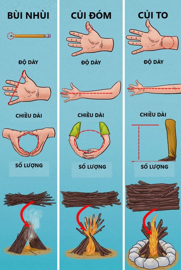 • Củi đóm: Các cành cây dày cỡ 3 hoặc 4 ngón tay và dài bằng cánh tay. Hãy gom thật nhiều cho tới khi ôm đủ bằng hai cánh tay.