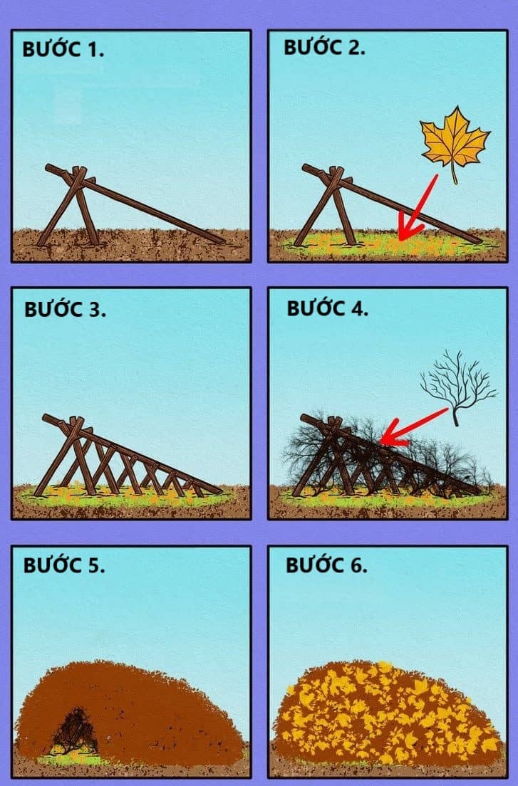 Đầu tiên, dựng khung lều bằng cách sử dụng một cành cây lớn và hai cành nhỏ hình chữ Y. Hãy đảm bảo rằng kích thước của cơ thể vừa vặn với khung lều đó. Sau đó, phủ một lớp lá khô khoảng 15-25cm trên mặt đất.