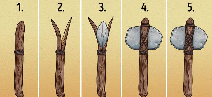 Bạn có thể làm một cái búa bằng cách tách một đầu nhánh cây thành 3 phần và đặt hòn đá vào khe hở. Sau đó, cố định bằng dây thừng hoặc các nhánh cây con mềm dẻo.