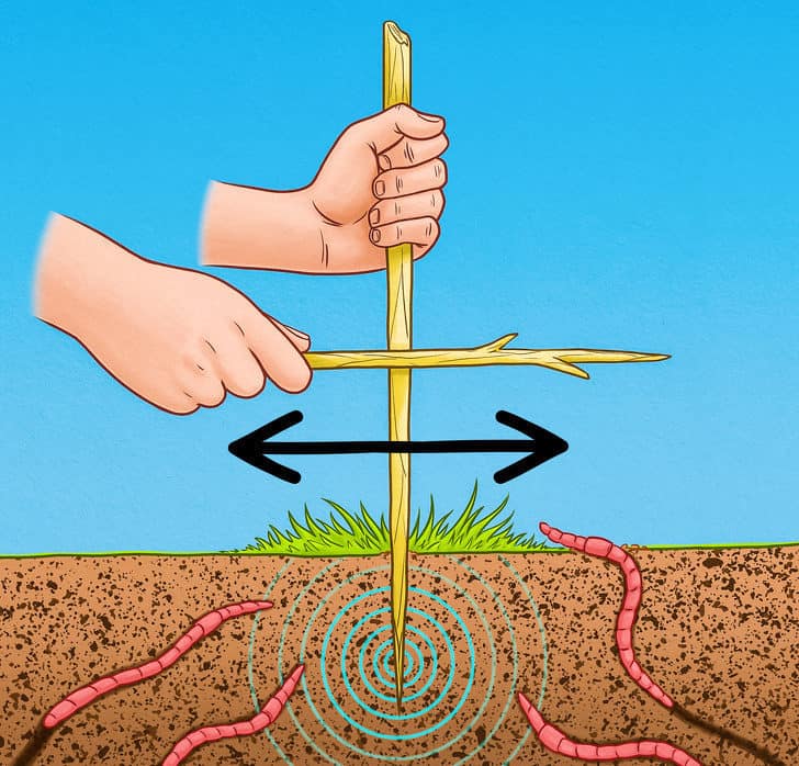 Trước khi câu cá, bạn nên tìm mồi, bằng cách kiếm một chỗ đất ẩm ướt và cắm một cây gỗ nát xuống đất. Sau đó, dùng một cây gỗ khác cọ xát với cây gỗ còn lại sao cho nó chuyển động xoay tròn theo chiều ngang. Khoảng 2 đến 3 phút sau, giun đất bắt đầu bò lên mặt đất và bạn có thể bắt chúng để làm mồi câu cá.