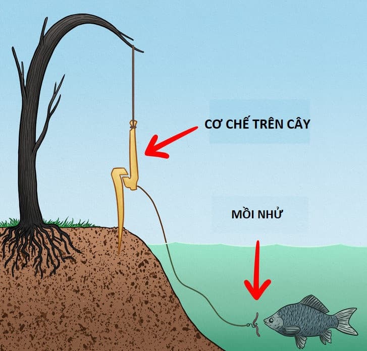 • Hãy tìm một cây nhỏ và gần bờ sông. Sau đó tìm hai nhánh cây khác, đóng một nhánh chặt xuống đất và nhánh còn lại treo lên cành cây đã được bẻ cong.