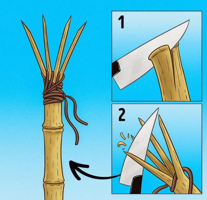 • Tách một đầu của cây thành 4 phần và dùng đá hoặc một con dao để mài nhọn các đầu.