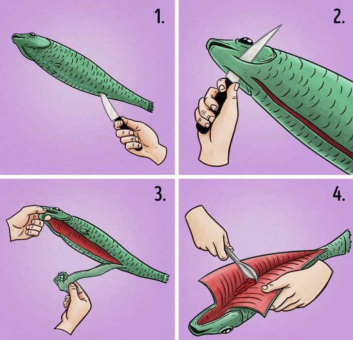 Làm sạch cá đúng cách là bước rất quan trọng mà bạn cần lưu ý, vì không phải ai cũng có thể thực hiện chỉ với một vài bước đơn giản và nhanh gọn. Sau khi rửa sạch cá và cạo hết vảy, hãy cắt một đường dài từ hậu môn đến về phía đầu cá.