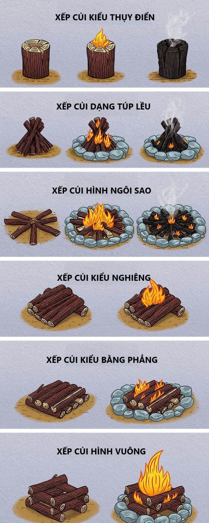 Nếu không biết lựa chọn cách xếp củi lửa phù hợp, việc duy trì một đống lửa trong thời gian dài là điều rất khó khăn. Vì thế, bạn nên lưu ý đến một vài cách xếp củi lửa để lựa chọn tùy theo trường hợp.