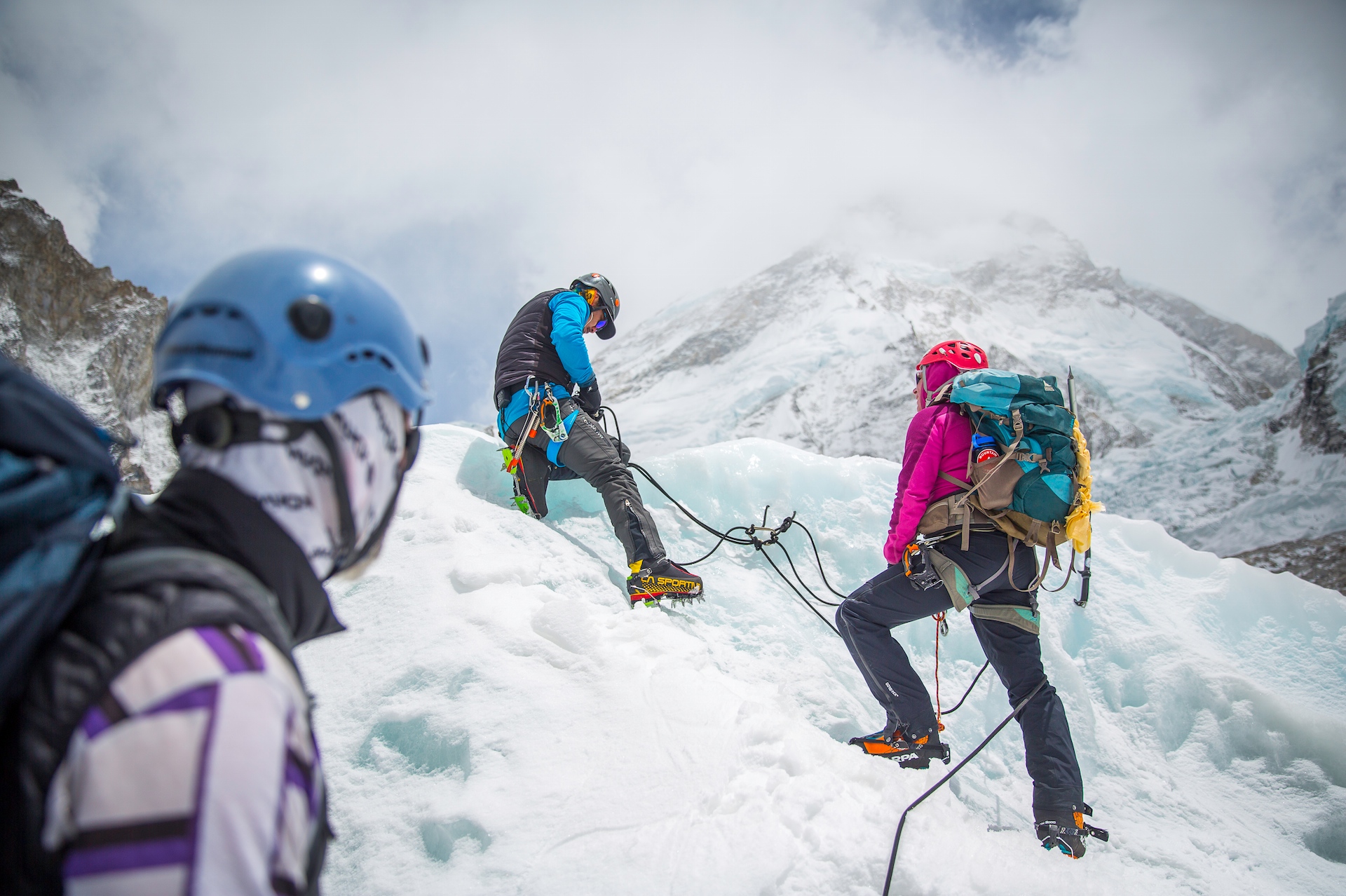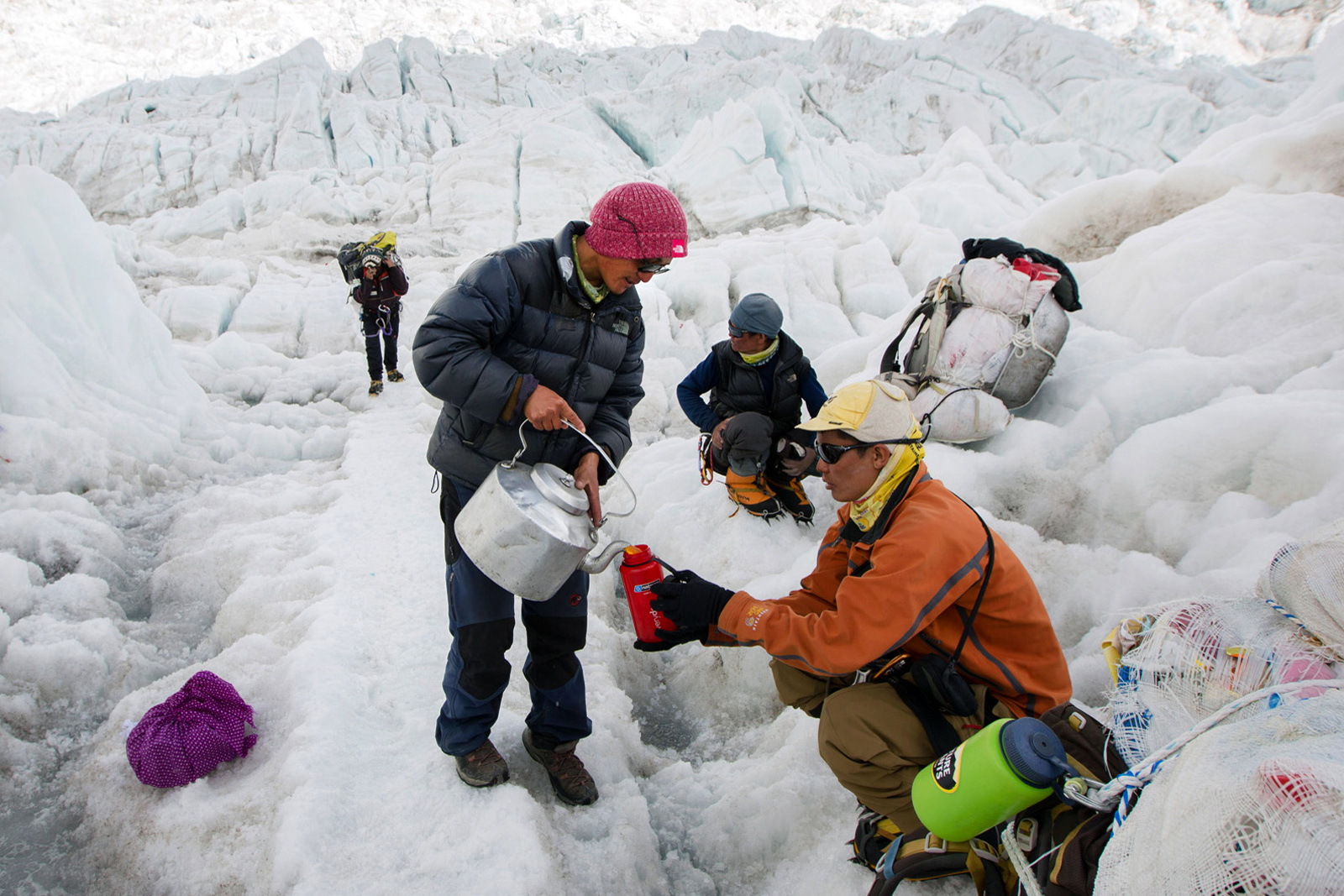 Luôn có một đến vài Sherpas đi theo để hỗ trợ mang vác hành lý, dẫn đường và cứu trợ các khách hàng trên Everest