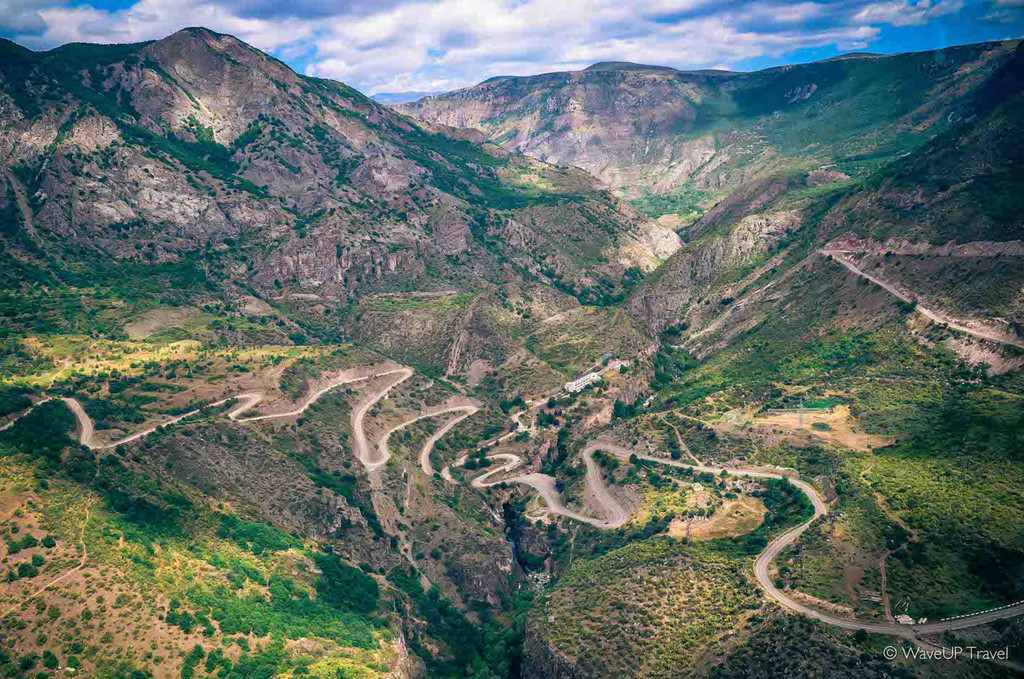 Con đường Caucasus (Nga) quanh co, hẹp, nối liền hồ Ritsa, Sochi và đi qua những ngọn núi hùng vĩ trong vùng. Caucasus được biết đến với những con dốc sởn gai ốc và nhiều khúc cua chữ Z ngay giữa lưng chừng núi. Ảnh: WaveUP.