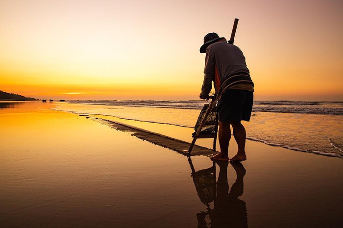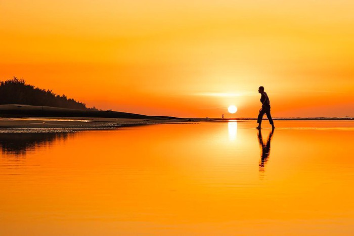 Khi những túi ngao đã đầy ắp, ngư dân lại chuẩn bị dóng thuyền thúng, bắt đầu công việc đánh bắt ngoài biển. Sự hòa quyện giữa màu vàng cam của nắng, ánh nâu từ cát tạo nên bức tranh Hồ Tràm sớm bình minh đẹp đến nao lòng. Cả không gian chìm đắm trong sắc màu huyền ảo, con người lúc này trông thật nhỏ bé giữa đất trời bao la.