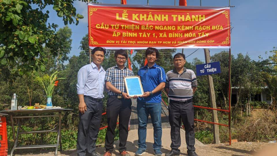 Trong một chuyến đi gần đây, anh cùng bạn bè đã trao tặng 30 chiếc xe đạp cho các em nhỏ tại địa phương và hỗ trợ kinh phí xây dựng cây cầu kênh Rạch Bứa, xã Bình Hòa Tây (Long An).