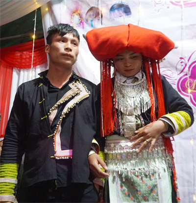 Trước khi tổ chức đám cưới ở nhà trai, gia đình cô dâu sẽ làm mâm cơm, mời người thân cùng bạn bè vào hôm trước. Lúc này, cô dâu diện trang phục cưới truyền thống của người Dao Đỏ ở Lai Châu.
