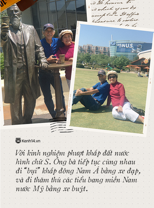 Ông bà đã có hàng chục lần đi phượt Nam, Bắc và 2 lần đi xuyên Việt. Với kinh nghiệm phượt khắp đất nước hình chữ S. Ông bà tiếp tục cùng nhau đi “bụi” khắp Đông Nam Á bằng xe đạp, và đi thăm thú các tiểu bang miền Nam nước Mỹ bằng xe… buýt.