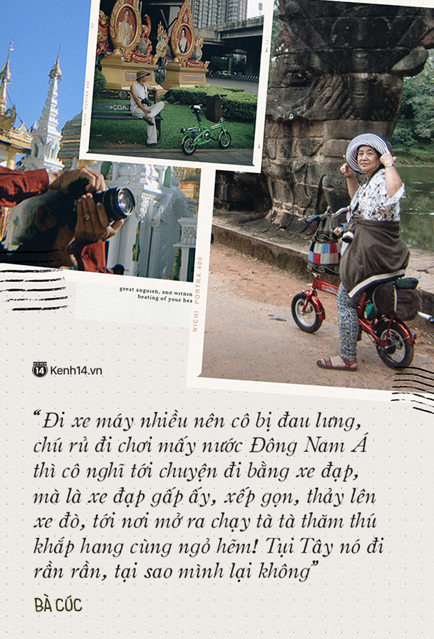 Bà Cúc chia sẻ “đi xe máy nhiều nên cô bị đau lưng, chú rủ đi chơi mấy nước Đông Nam Á thì cô nghĩ tới chuyện đi bằng xe đạp, mà là xe đạp gấp ấy, xếp gọn, thảy lên xe đò, tới nơi mở ra chạy tà tà thăm thú khắp hang cùng ngõ hẻm! Tụi Tây nó đi rần rần, tại sao mình lại không”.