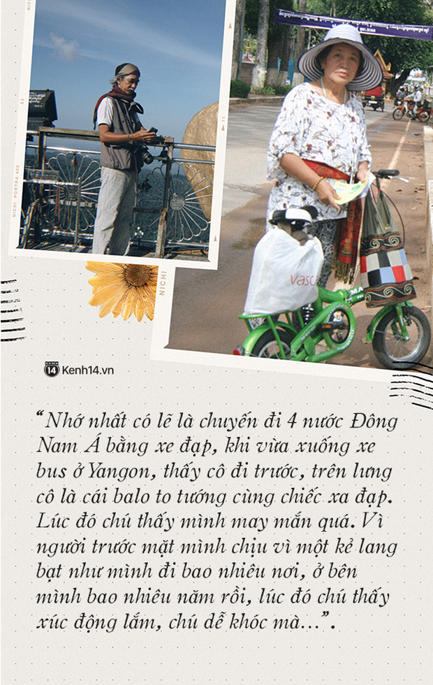Ông Minh bồi hồi “Nhớ nhất có lẽ là chuyến đi 4 nước Đông Nam Á bằng xe đạp, khi vừa xuống xe bus ở Yangon, thấy cô đi trước, trên lưng cô là cái balo to tướng cùng chiếc xe đạp. Lúc đó chú thấy mình may mắn quá. Vì người trước mặt mình chịu vì một kẻ lang bạt như mình đi bao nhiêu nơi, ở bên mình bao nhiêu năm rồi, lúc đó chú thấy xúc động lắm, chú dễ khóc mà…”.