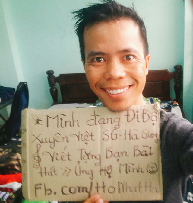 Với đôi chân tuổi trẻ khao khát chinh phục những miền đất lạ, Hồ Nhật Hà đã bắt đầu hành trình đi bộ xuyên Việt khi trong túi chỉ có vỏn vẹn 100k. Vừa đi, anh vừa kiếm thêm tiền. Kết thúc hành trình, anh được một người bạn tặng cho chiếc vé máy bay để về quê hương Phú Yên.