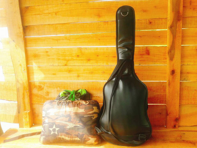 Hành lý theo anh Hà đi bộ xuyên Việt đơn giản đến bất ngờ, chỉ có 3 bộ quần áo, thuốc dự phòng đau ốm, 20 thanh lương khô, 1 cái vòng, 1 cây đàn guitar, điện thoại, camera hành trình, băng bông và sách.