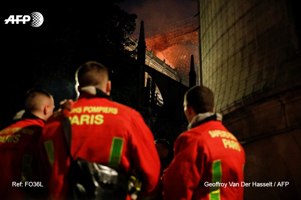 Những nhân viên cứu hoả đã làm việc suốt đêm để cố gắng cứu lấy Nhà thờ. Ảnh: AFP
