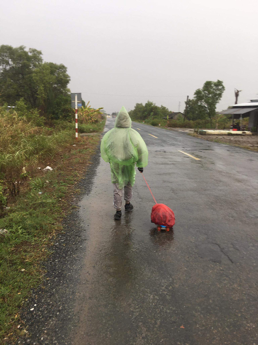 Tay kéo chiếc xe ván trượt tự chế đựng hành lý, Hân đi xuyên Việt.