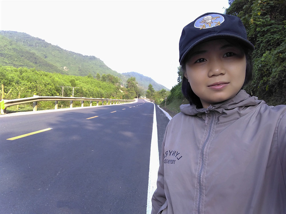 Hân chụp hình kỷ niệm khi đi trên đường quốc lộ.