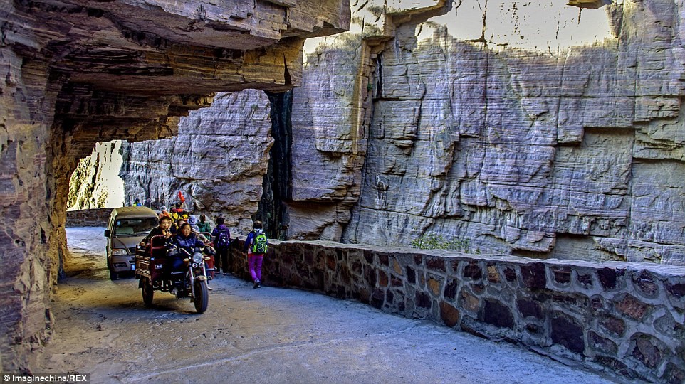 Dân làng cử 13 thanh niên khỏe mạnh xây dựng đường hầm xuyên núi từ năm 1972. Không có dụng cụ tiên tiến hay điện, họ dùng 4.000 chiếc búa để khoan 12 tấn đá. Con đường hoàn thành vào tháng 5/1977, chỉ đủ rộng cho 2 chiếc ôtô lưu thông. Đến nay, ngôi làng vẫn còn lưu giữ 13 bức tượng tạc những người đàn ông đã có công đào núi làm hầm. Ảnh: Lydiosophy, realhumanbeen.
