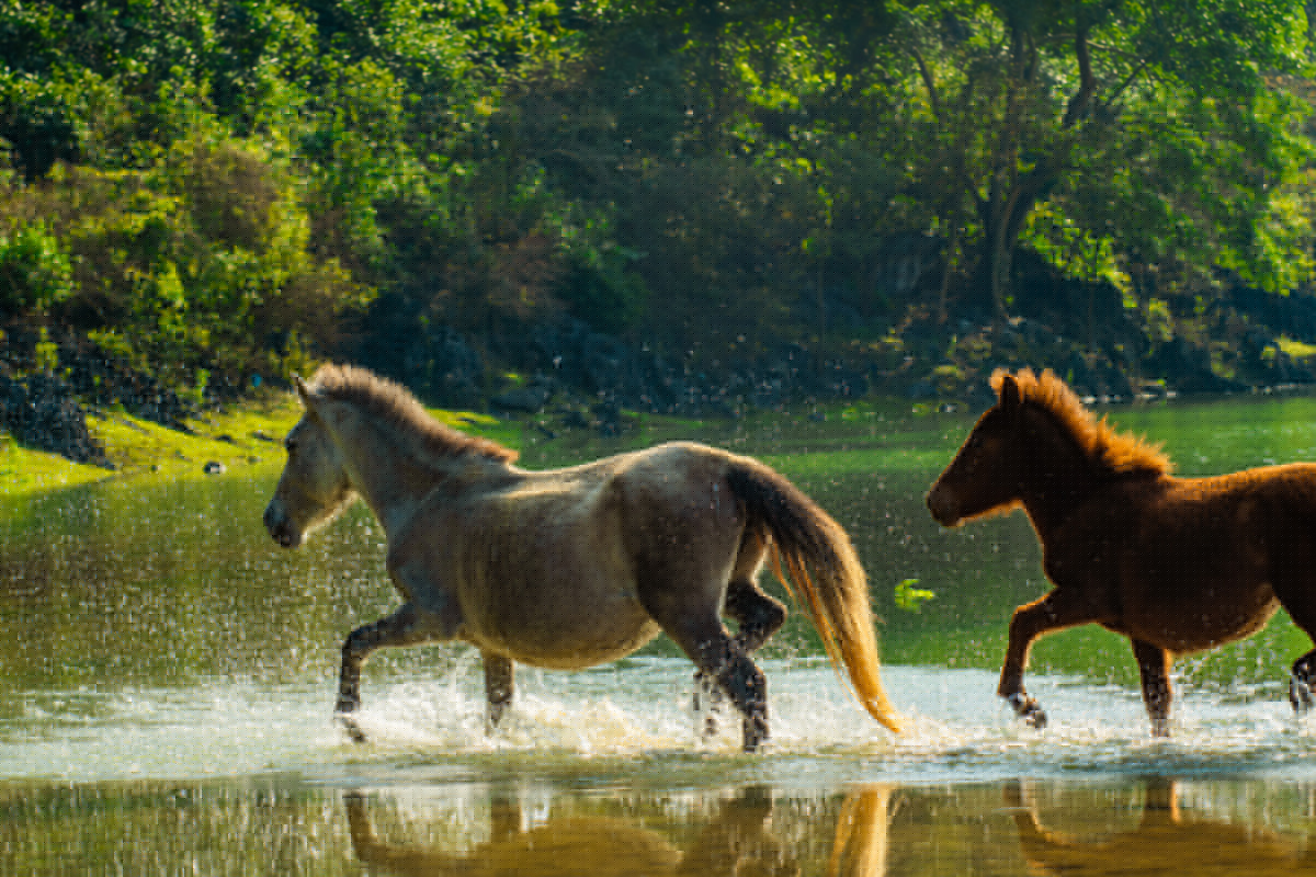 Mùa nước cạn, người dân trong khu vực làm nương rẫy nên chăn thả trâu, ngựa đi ăn cỏ. Tác giả chia sẻ ở đây chỉ có vài hộ dân nuôi ngựa, họ không làm chuồng trại mà chăn thả tự do, cách vài ngày sẽ tới thăm chúng một lần. Vẻ đẹp thanh bình, hoang sơ này thu hút nhiều du khách cũng như nhiếp ảnh gia tới săn ảnh.