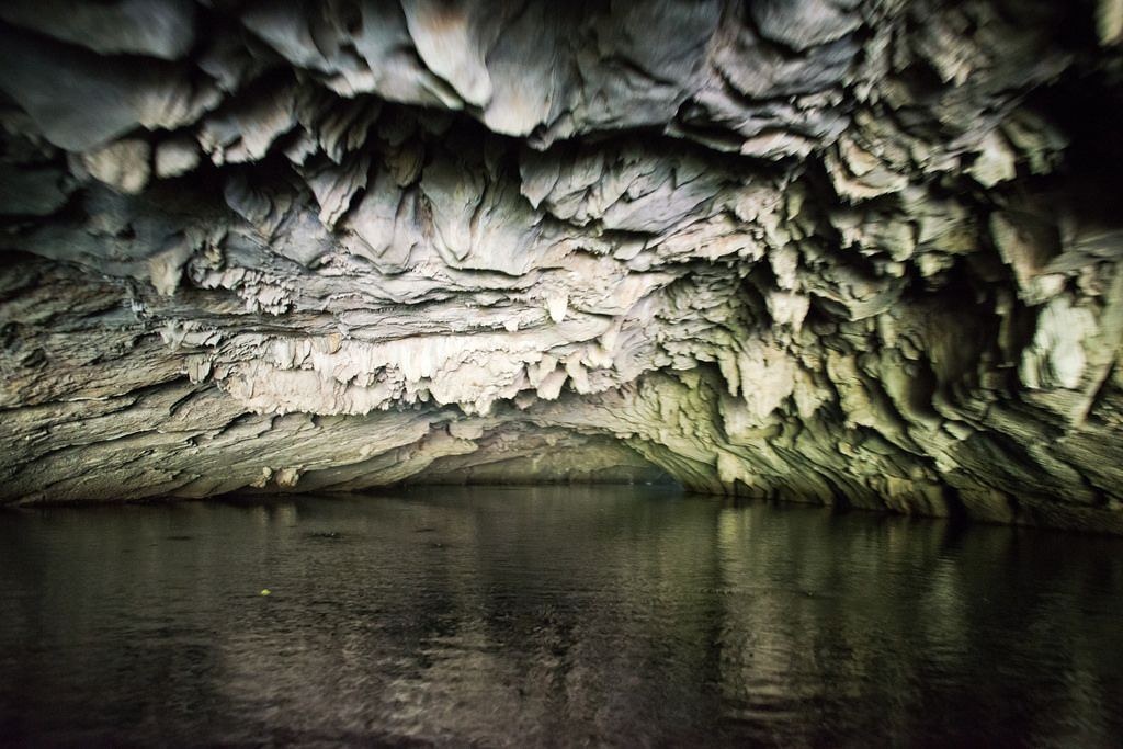 Bên trong hang Cả. Do đi thuyền để vãn cảnh nên tốc độ khá chậm, cộng với trần hang không cao nên du khách hoàn toàn có thể với tay lên để chạm vào, rất mát và một số chỗ có thể bị ngấm nước nên chảy thành từng giọt, khá thú vị. (Ảnh: Mytour)