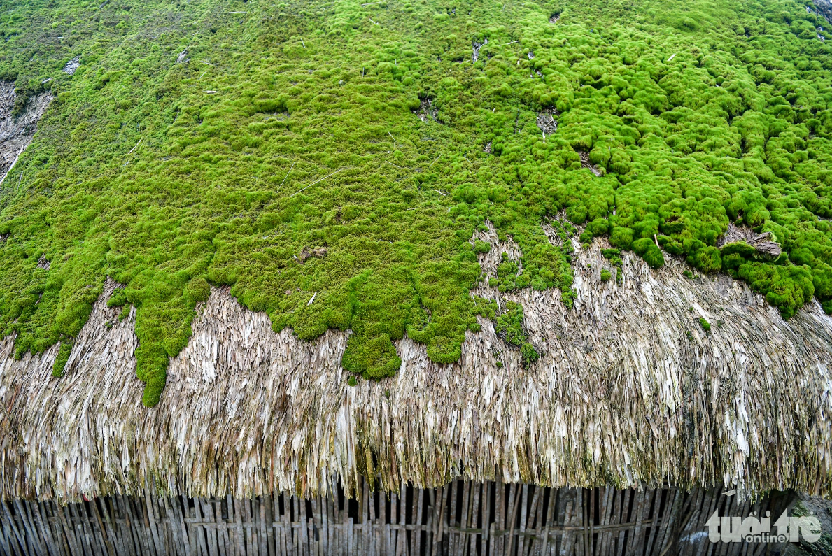 Cũng lợp mái lá cọ như những ngôi nhà sàn dưới núi, nhưng ở đây những chiếc mái này thật đặc biệt: chúng phủ đầy rêu.