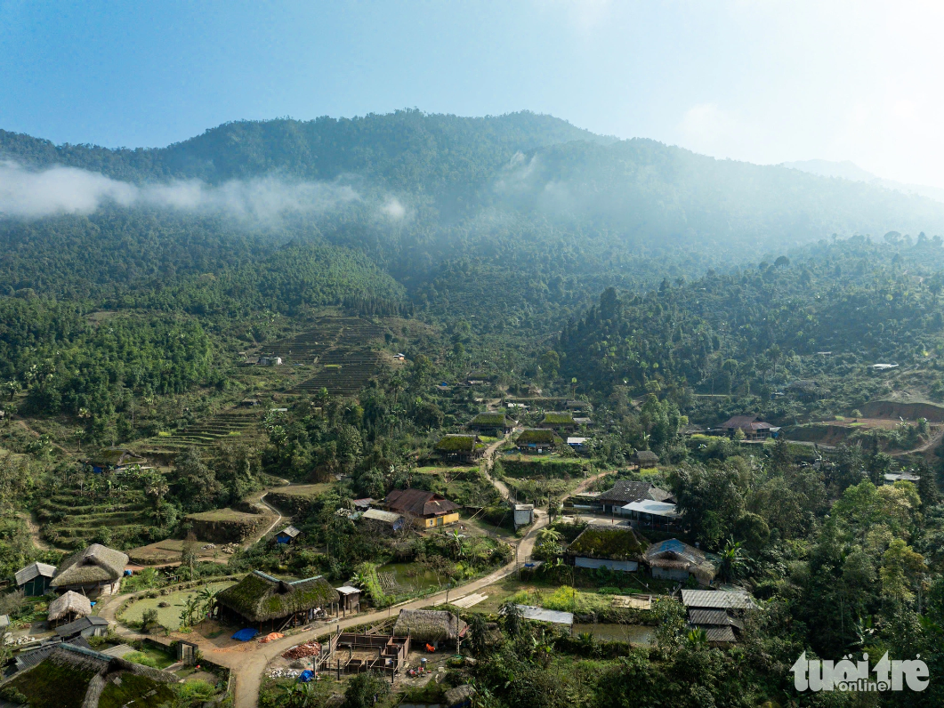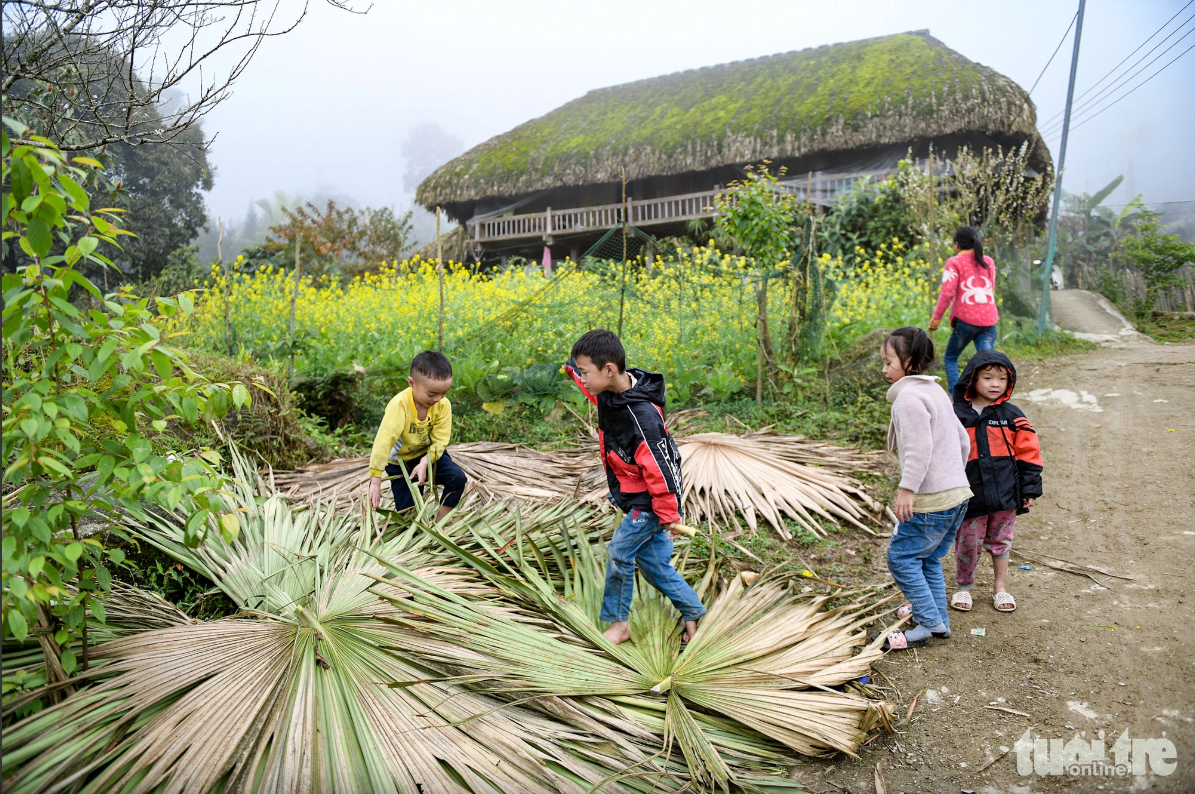 16h, nắng chợt lên sau hơn một tuần thiếu vắng. Ánh nắng cuối chiều như rắc vàng trên những ngôi nhà sàn mái rêu phong, khiến chúng như lấp lánh xanh. Cả bản Xà Phìn yên bình với tiếng nói cười của lũ trẻ, của tiếng chim ríu rít gọi nhau.