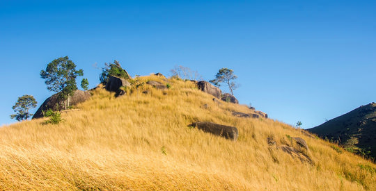 Khi những cơn gió mùa Đông Bắc đầu tiên tràn về trên xứ Tây Nguyên này, báo hiệu thời điểm bắt đầu chuyển sang mùa khô. Khi ấy bầu trời cao hơn và xanh ngăn ngắt, nắng giòn hơn, vạn vật cây cối dần chuyển sang màu vàng đặc trưng của mùa khô Tây Nguyên. Trải dài bạt ngàn trên khắp các sườn đồi đất đỏ bazan là màu vàng úa của cỏ đuôi chồn chạy xa ngút ngàn tầm mắt.
