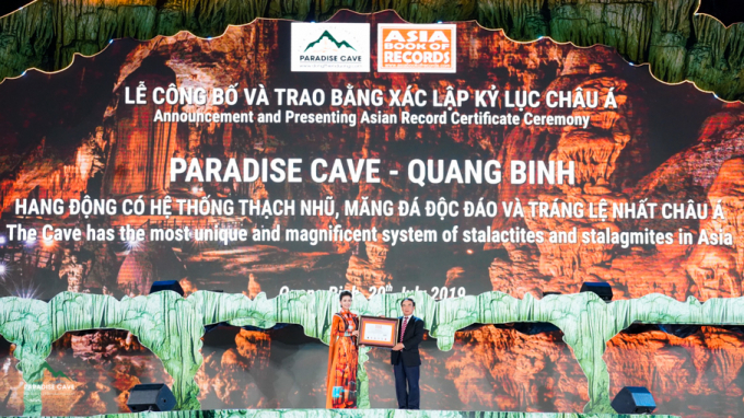 Trước đó, động Thiên Đường cũng đã được Tổ chức Kỷ lục Việt Nam trao bằng xác lập 2 kỷ lục: “Động khô dài có hệ thống thách nhũ độc đáo nhất Việt Nam” và “Động có cầu gỗ dài nhất Việt Nam”.