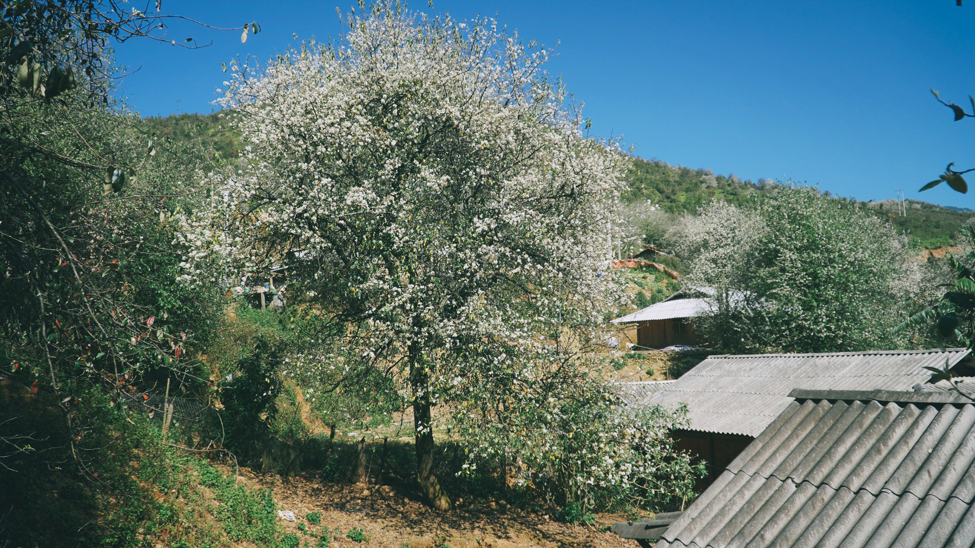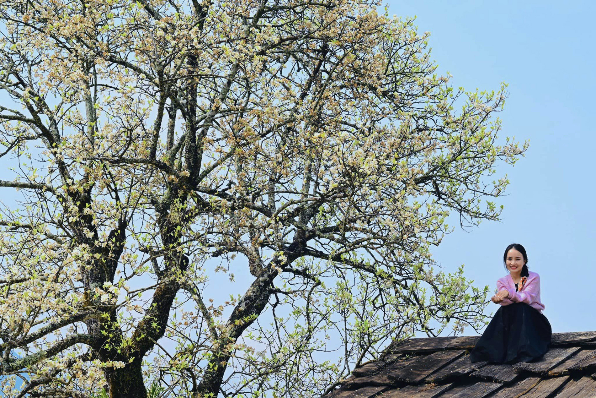 Vượt qua nỗi sợ độ cao, chị Thủy Loan cẩn thận leo lên nóc nhà của một căn homestay ở bản Nậm Nghiệp rồi canh góc chụp để có những bức ảnh tuyệt đẹp với hoa sơn tra từ trên cao.