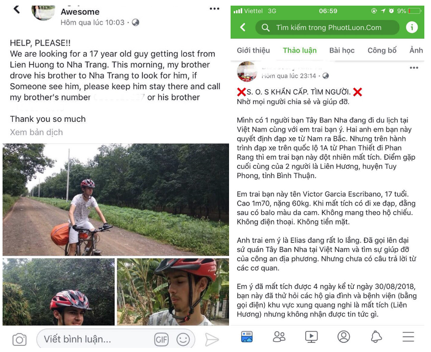 Tài khoản Nguyen Kim Oanh đăng tải: "Tôi muốn tìm Victor Garcia Escribano, 17 tuổi, người Tây Ban Nha. Em đi phượt xe đạp cùng anh trai Elias từ TP.HCM ra Hà Nội. Em vừa đến TP.HCM thì bị mất cắp điện thoại và tiền bạc, ra đến Phan Rí (Bình Thuận) lại lạc anh trai... Tôi và mọi người rất mong cộng đồng giúp đỡ, tìm được em sớm nhất có thể".