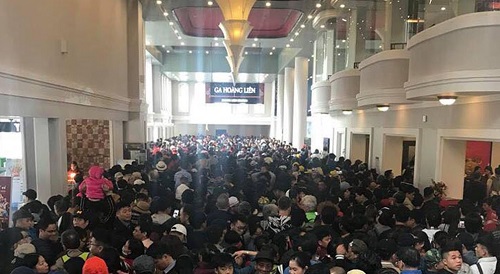 Sáng 30/4, hàng nghìn du khách đổ về ga cáp treo Sa Pa để lên tham quan nóc nhà Đông Dương khiến khu vực này nhanh chóng trở nên đông đúc. Càng về trưa, lượng khách càng đông. Hệ thống cáp treo có khả năng vận chuyển 2.000 người mỗi giờ cũng không đủ đáp ứng nhu cầu. Hành khách phải chờ đợi trên cả tiếng đồng hồ vẫn chưa đến lượt.