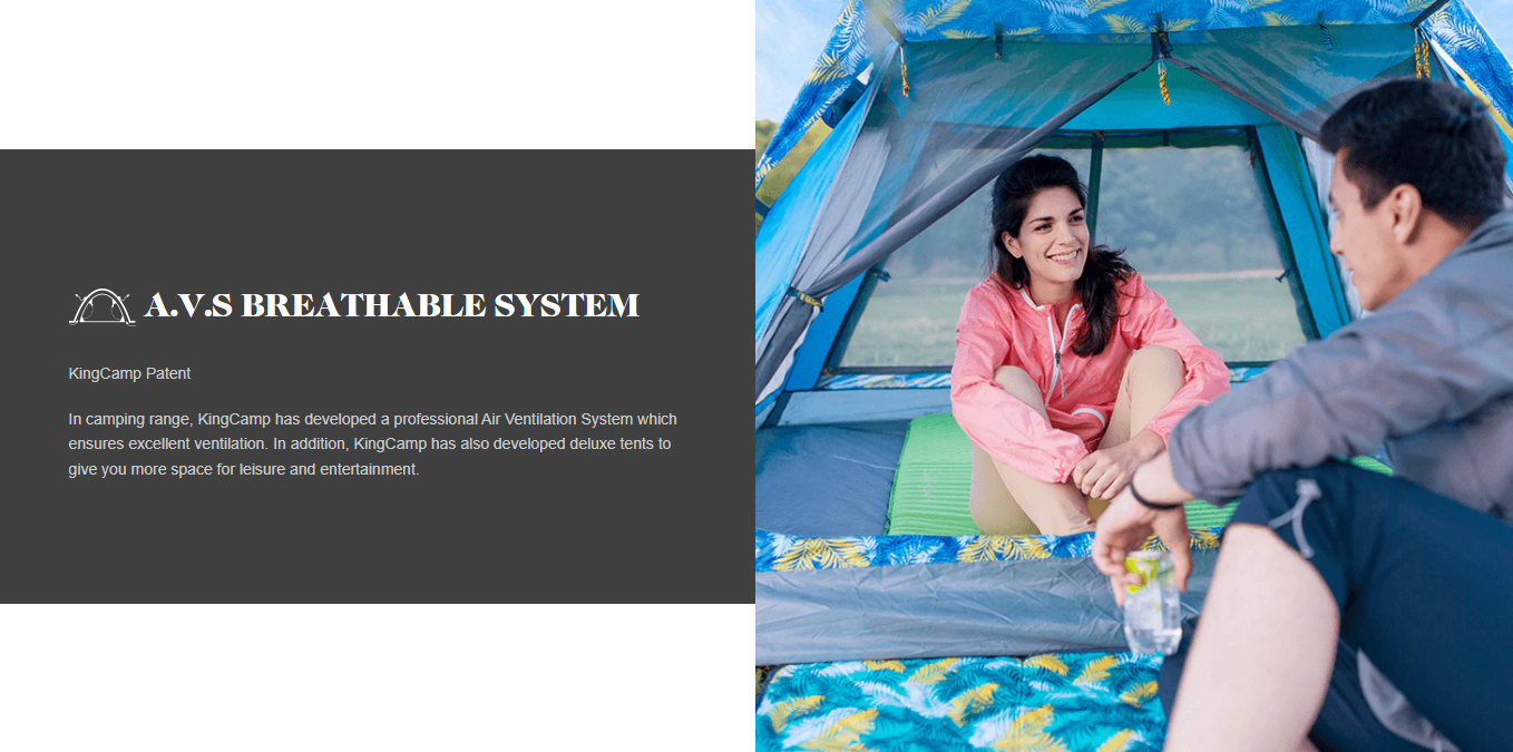 Trong lĩnh vực lều cắm trại, KingCamp đã phát triển Hệ thống thông gió chuyên nghiệp đảm bảo độ thông thoáng tốt. Ngoài ra, thương hiệu còn sản xuất các loại lều chất lượng cao để bạn có thể tùy chọn không gian vui chơi, giải trí.