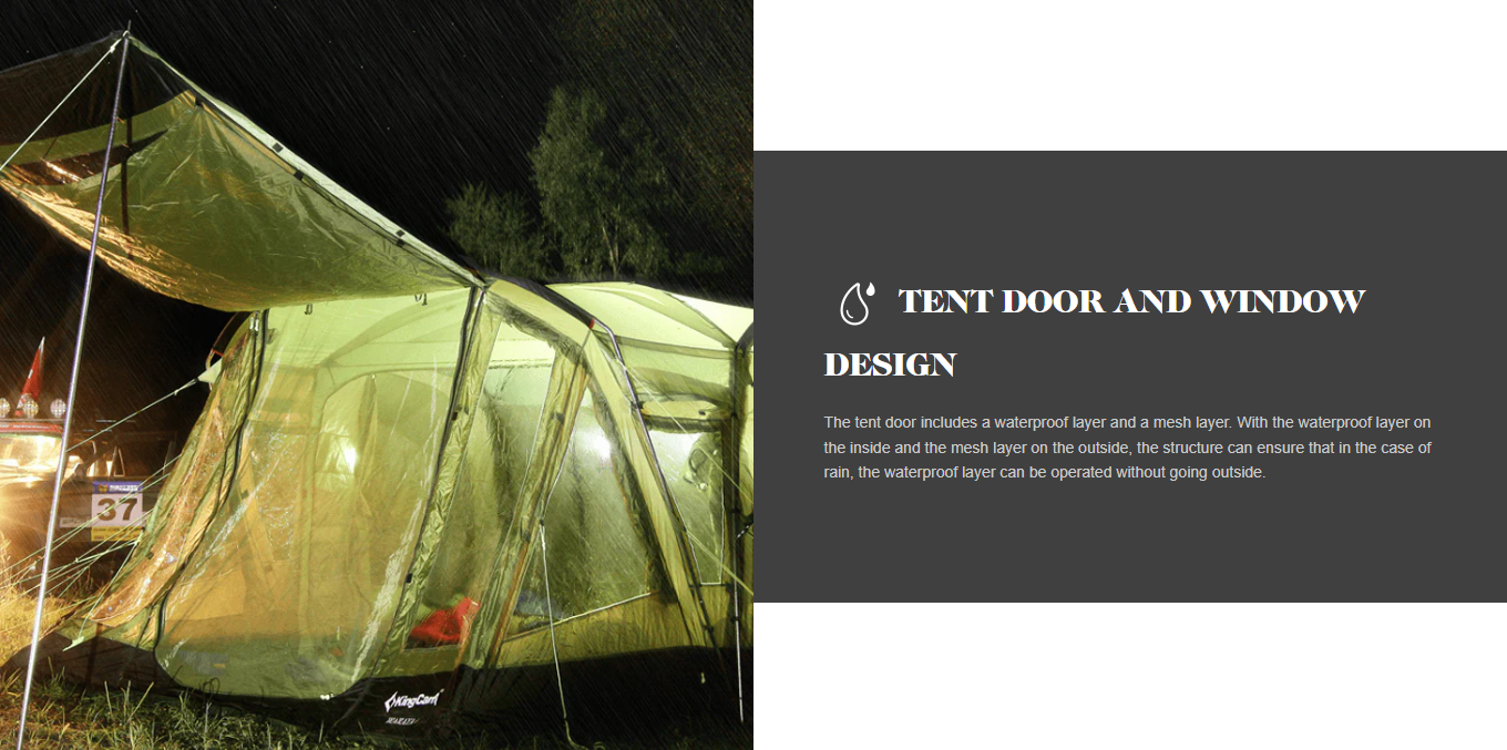 Cửa lều bao gồm 2 lớp là lớp chống thấm bên trong và lớp lưới bên ngoài. Cấu trúc này đặc biệt hữu ích khi trời mưa, giúp người dùng có thể linh động mở hoặc điều chỉnh lớp chống thấm nước mà không cần phải ra ngoài lều.