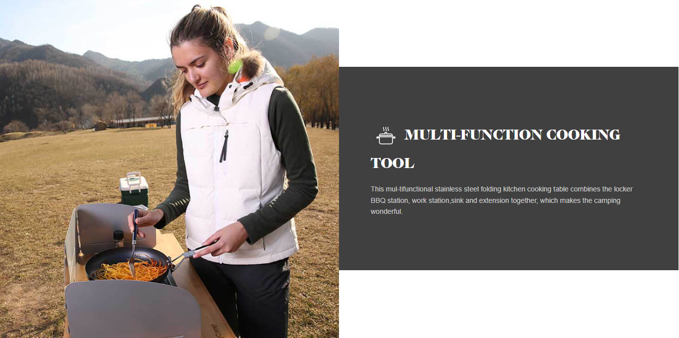 Bàn nấu gấp bằng thép không gỉ đa năng này là sự kết hợp giữa các tính năng như khu vực bếp BBQ có tủ khóa, bàn chuẩn bị đồ ăn, bồn rửa và phần mở rộng, giúp cho buổi cắm trại trở nên tuyệt vời hơn với đầy đủ tiện nghi.