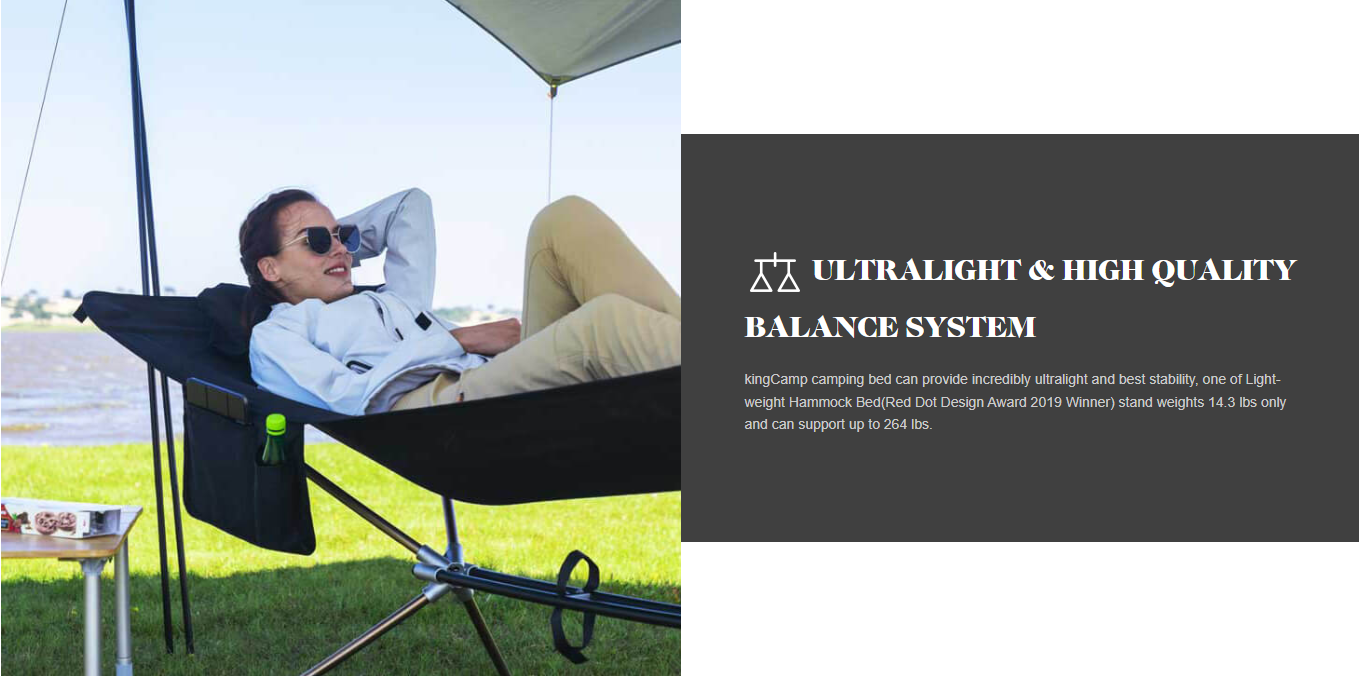 Giường cắm trại KingCamp có trọng lượng siêu nhẹ và độ ổn định tốt nhất. Một trong những sản phẩm tiêu biểu là Giường võng siêu nhẹ (Đạt Giải thưởng Thiết kế Red Dot 2019) chỉ nặng 6,5 kg và có thể chịu được trọng lượng lên đến 120 kg.