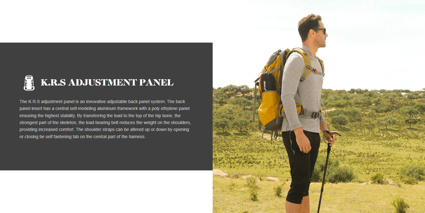 Đây là hệ thống khung trợ lực có thể điều chỉnh với miếng đệm lưng có khung nhôm tự định hình ở giữa với tấm polyetylen đảm bảo độ ổn định cao nhất. Bằng cách chuyển trọng lượng lên phần trên của xương hông, phần xương chắc nhất, dây đeo chịu lực giúp giảm trọng lượng trên vai và mang lại sự thoải mái. Dây đeo vai có thể điều chỉnh lên xuống bằng cách mở hoặc đóng khóa dán tự dính ở phần giữa của dây đeo.
